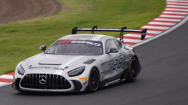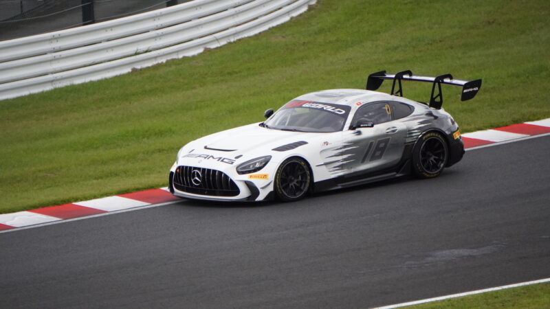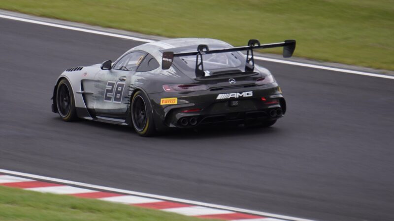 ピットウォークが終わり、17:05から始まる予選を見るため鈴鹿サーキットでいい撮影場所はないかとグランドスタンド、1コーナーからS字、逆バンクに移動して待っていると、見慣れないAMGがサーキットを周回しています。(2025.9.13 16:26)