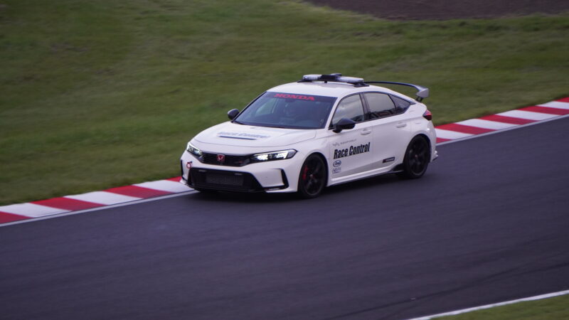 レースコントロールカーが周回してきました、予選再開にはしばらく時間が掛かりそうなので今日は引き上げることにしました。