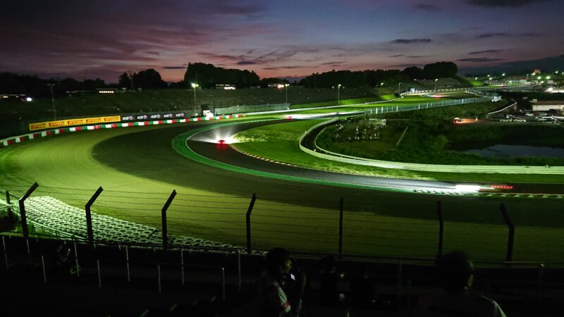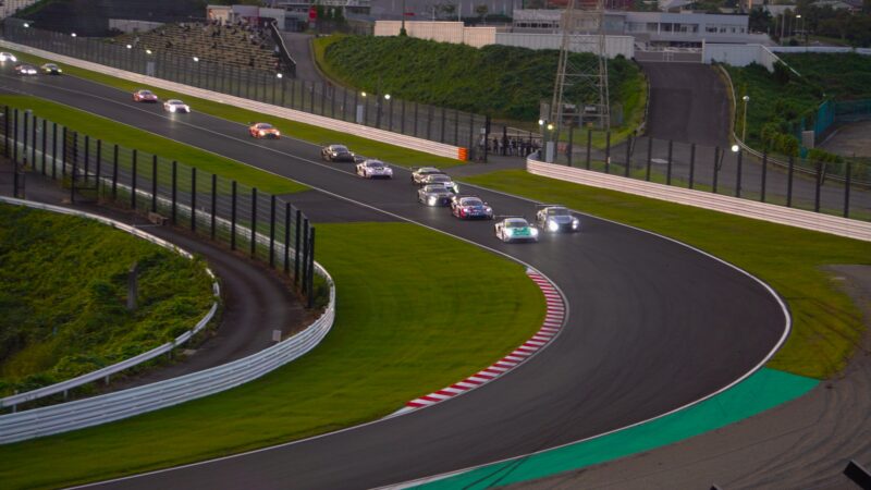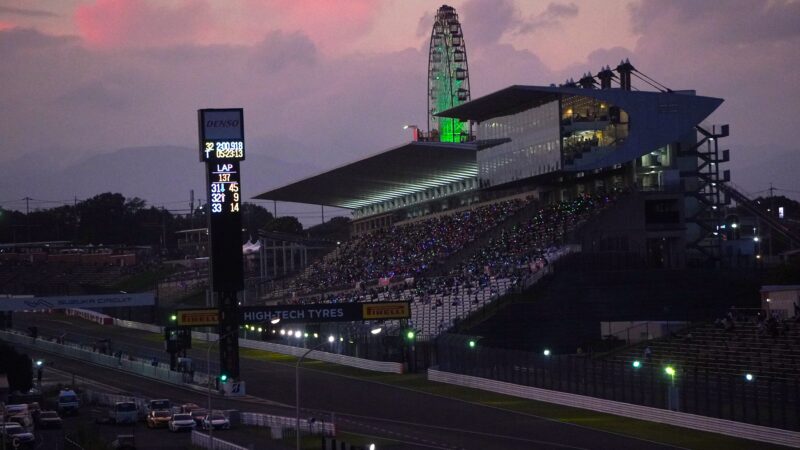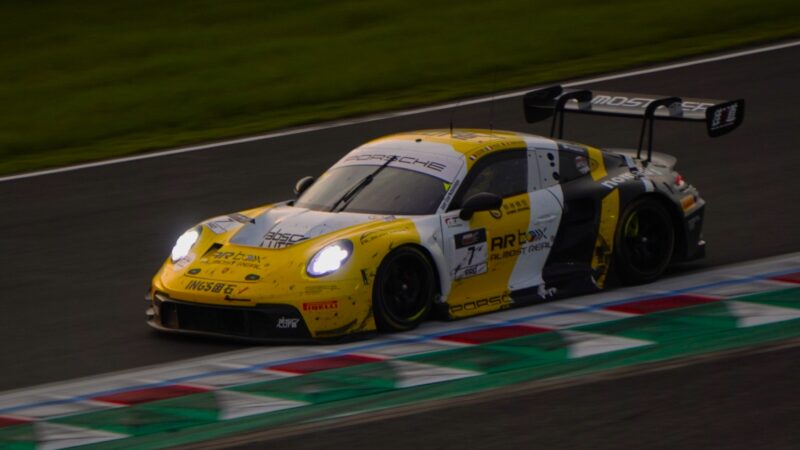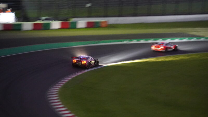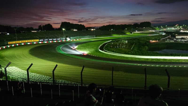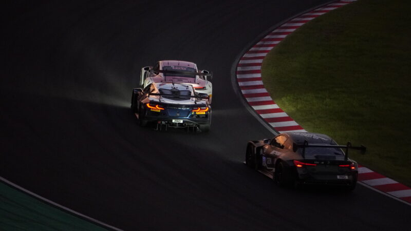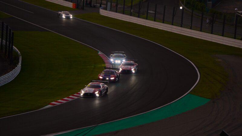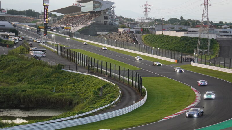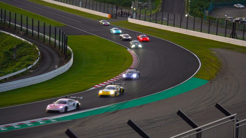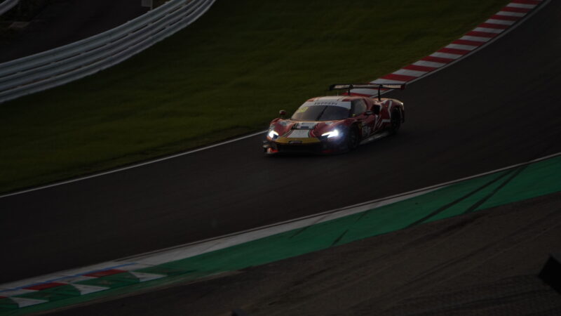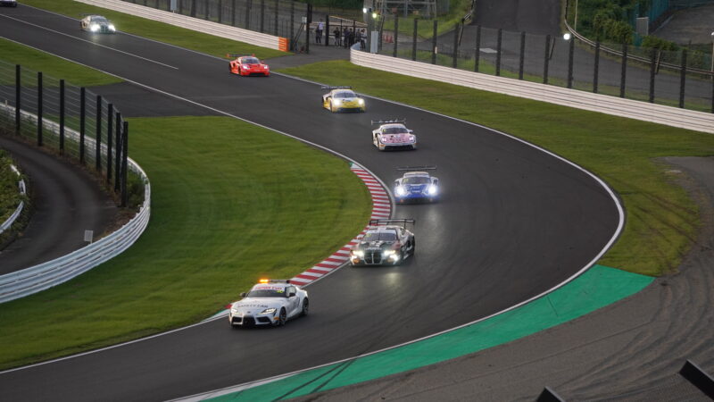 555号車マエザワ・レーシングのフェラーリ296 GT3が、130Rでスピンしながらコースアウトしクラッシュした、車両の回収のため長めのFCY(フルコースイエロー)になり、その後SC(セーフティカー)の導入になった。