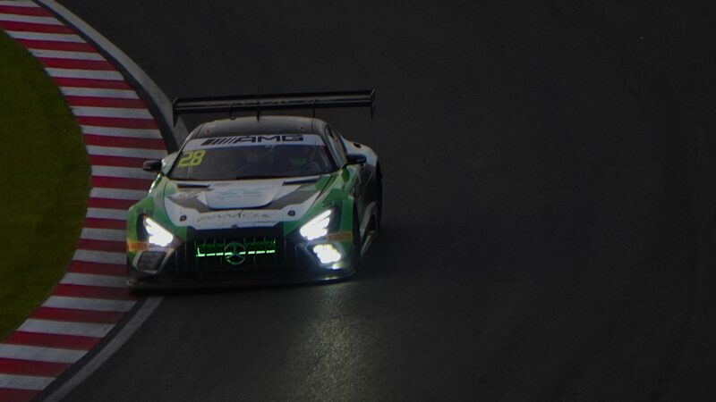 28号車クラフト・バンブー・レーシングのメルセデスAMG GT3エボは緑色のLEDライトで違いが判る。