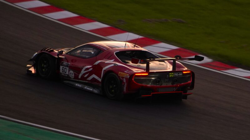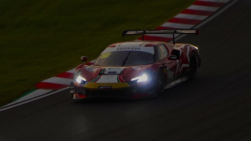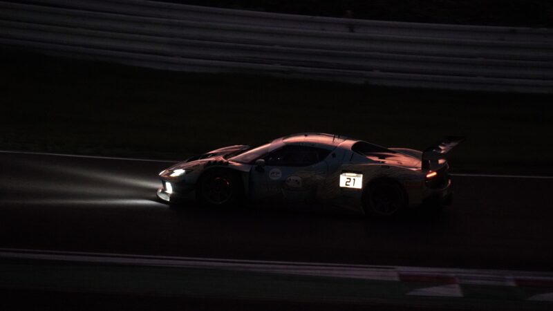 21号車ハーモニー・レーシング フェラーリ296 GT3 ボディのゼッケンナンバーが字光式のナンバープレートみたいで闇夜のサーッキットに浮かび上がる。
