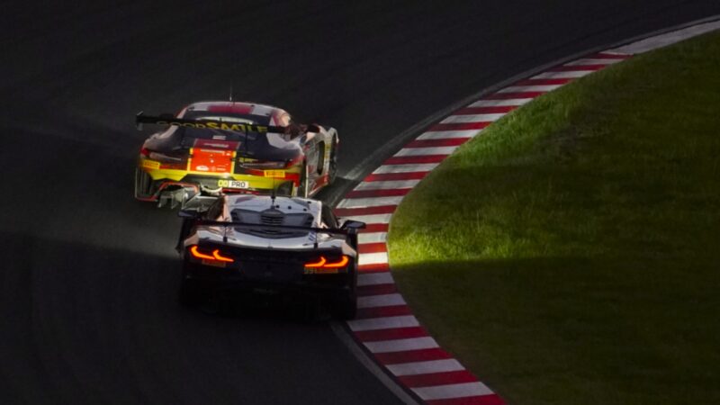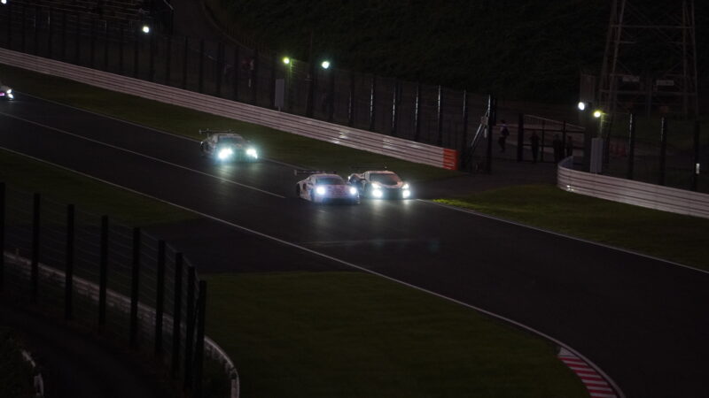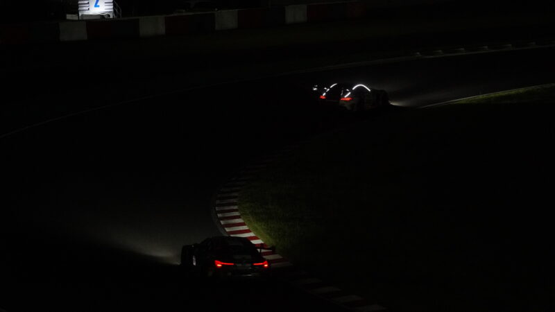 激しい3位争いが目の前を通過、この2台はその後もゴールまでこの状態が続きました、暗闇の中でギリギリの攻防が続く。