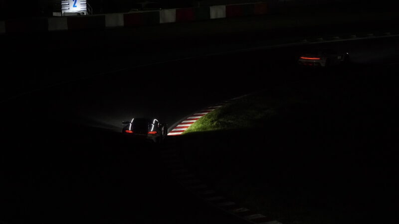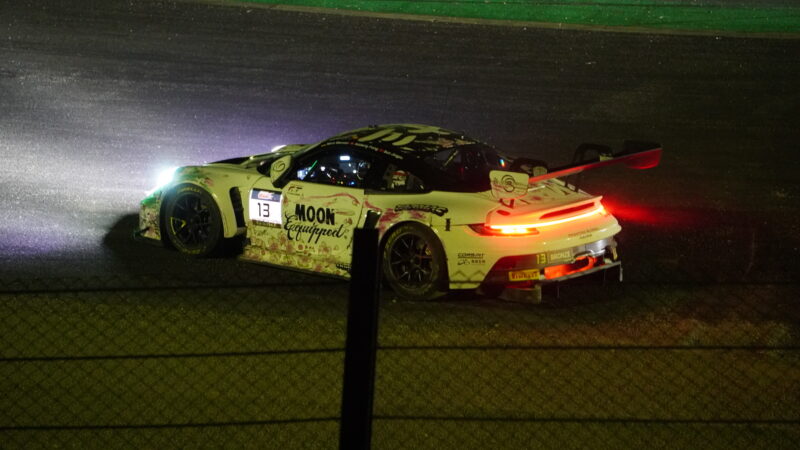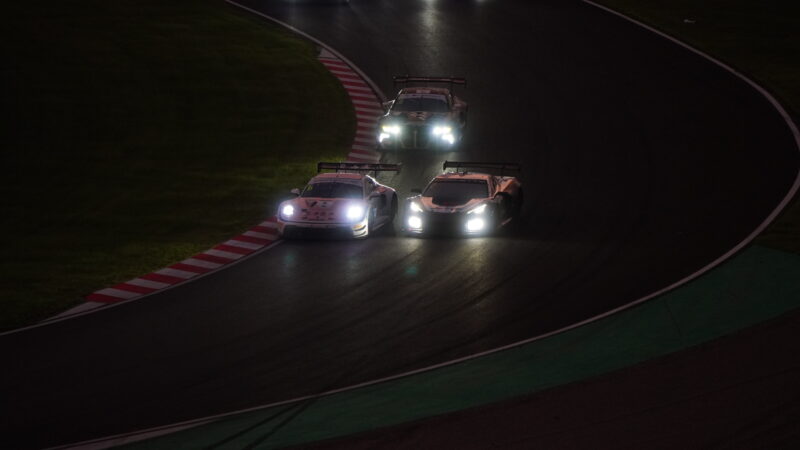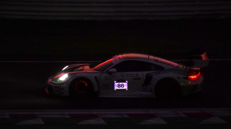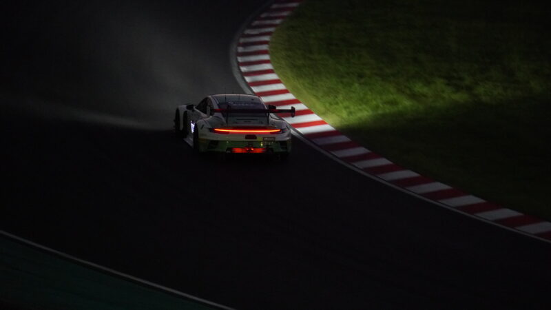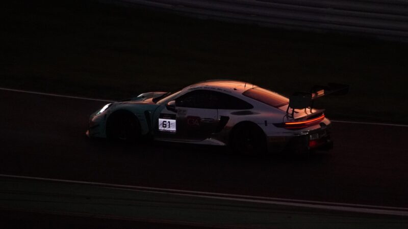 61号車EBMギガ・レーシングのポルシェ911 GT3 R(992)の特徴的なカラーリングもこの暗闇では見えなくなってきた。