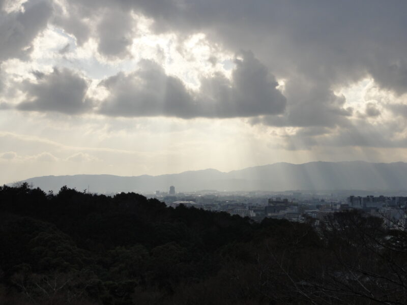 ちなみによく見るのは、雲の切れ間から太陽の光が柱のように上から地上に降り注ぐ現象、「天使の梯子」(エンジェルラダー)とか「天使の階段」と呼ぶそうです。写真は2019年2月4日 京都の清水寺で撮影したものです。(このときも、こんな呼び方を知ったのはずっと後の事でした)