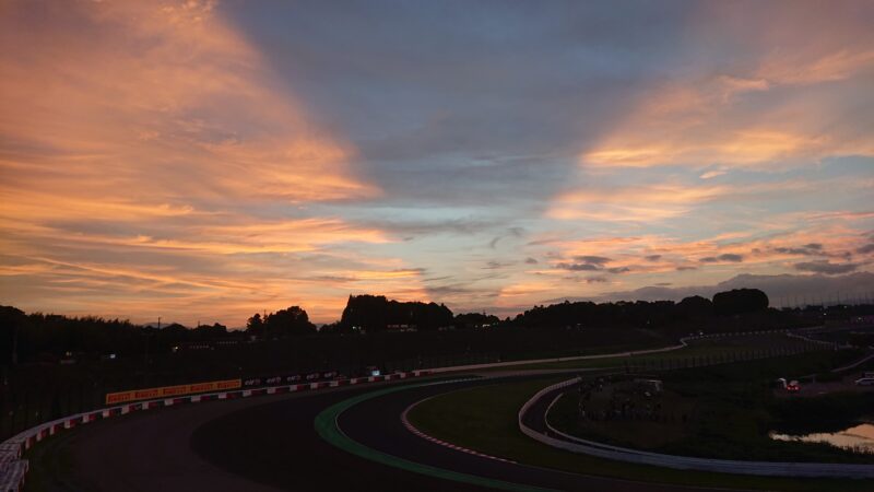 鈴鹿サーキットに夕暮れが訪れ、太陽が沈んで行った時に、空の色が明るい所と暗い場所でくっきりと分かれるなんだか不思議な現象が起こった。
