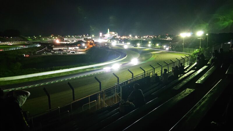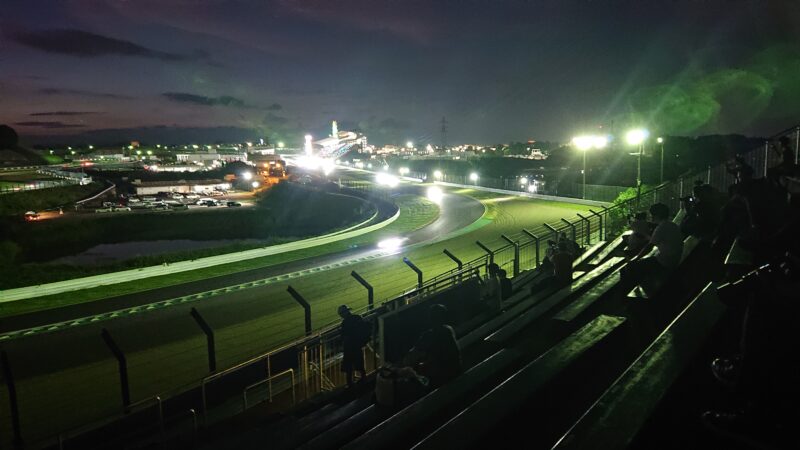 グランドスタンドのペンライトが揺れる中、観覧車のグリーンのライトアップが際立って目立ちます。ドライバーは見る余裕とかあるのかな?
