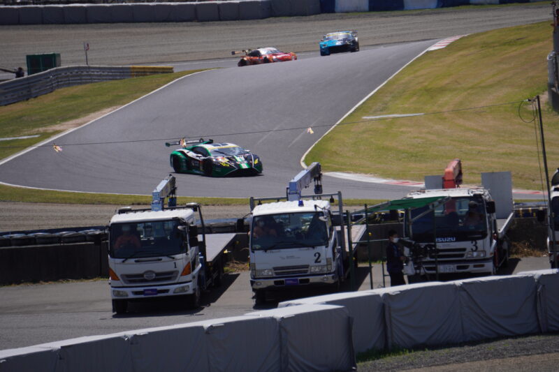 ヘアピンコーナーを立ち上がり、リボルバーコーナーへ進入する車両を狙いますが、レッカー車と電線が写り込んでしまいます。(2026.4.12 12:06)