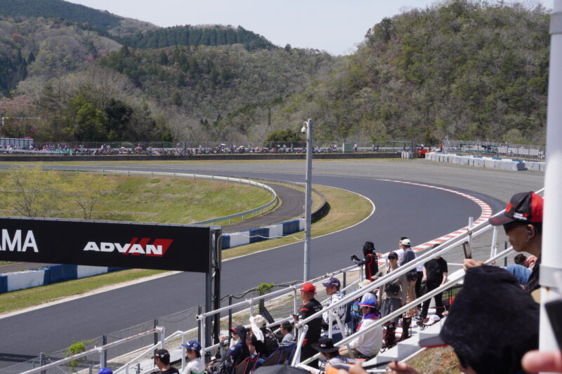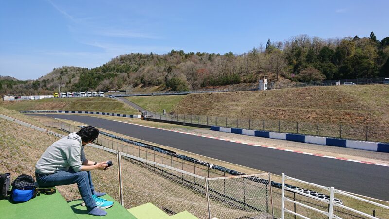 ここならフェンスも無く近い場所を通過する車両を見れそうです。2輪シケインの向うにはリボルバーコーナーも見えます。(2026.4.12 11:46)