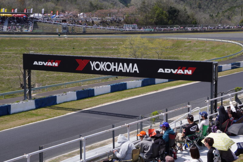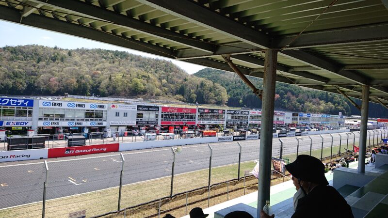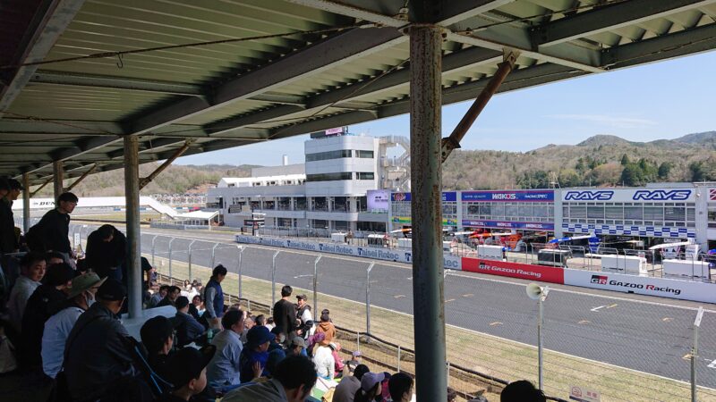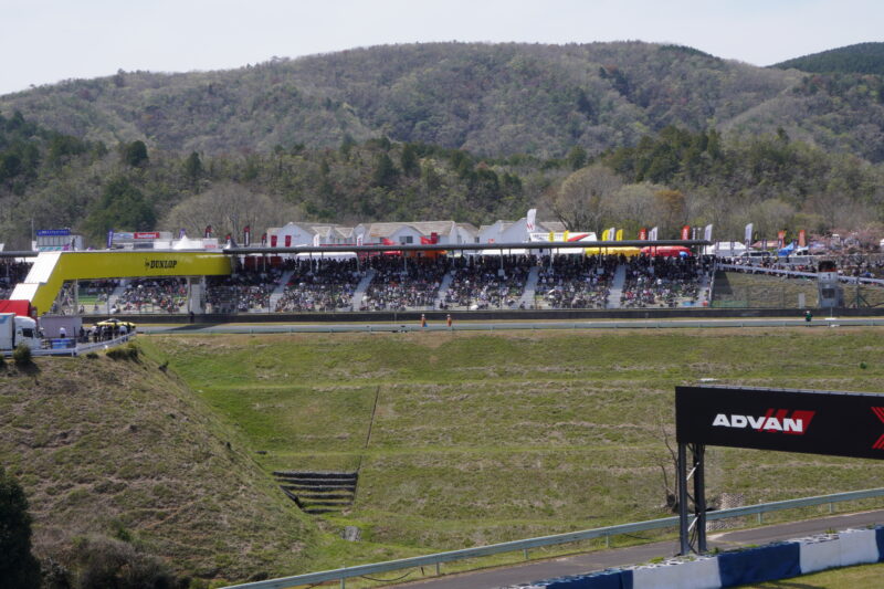第一コーナー出口側から見たグランドスタンドの風景、左側の黄色いダンロップブリッジを渡るとパドックに行くことが出来ます。(2026.4.12 12:34)