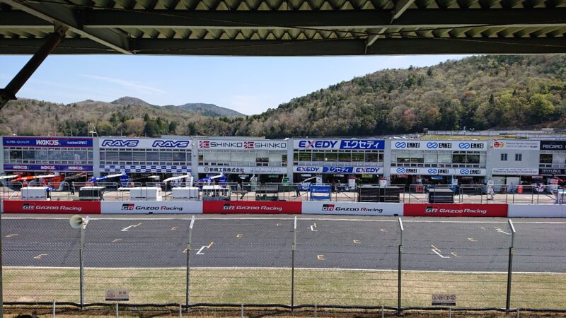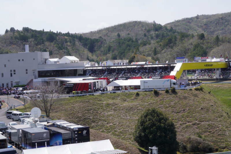 グランドスタンドから見たコントロールタワーとピット(2026.4.12 11:18)