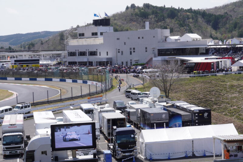 第一コーナー出口側から見たコントロールタワーとパドック裏側の風景。(2026.4.12 12:34)