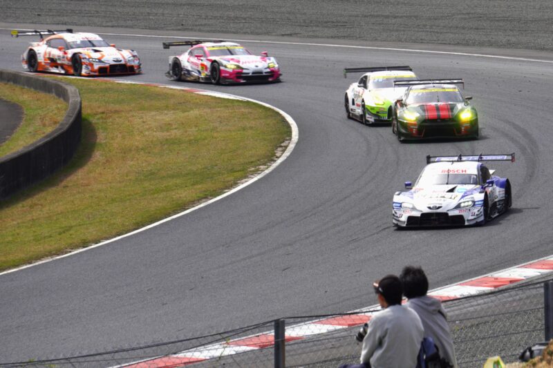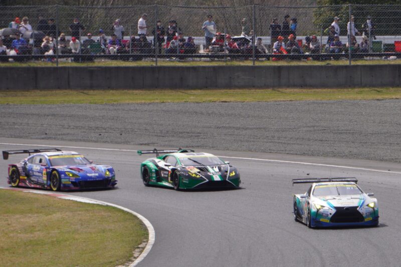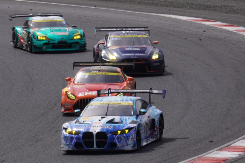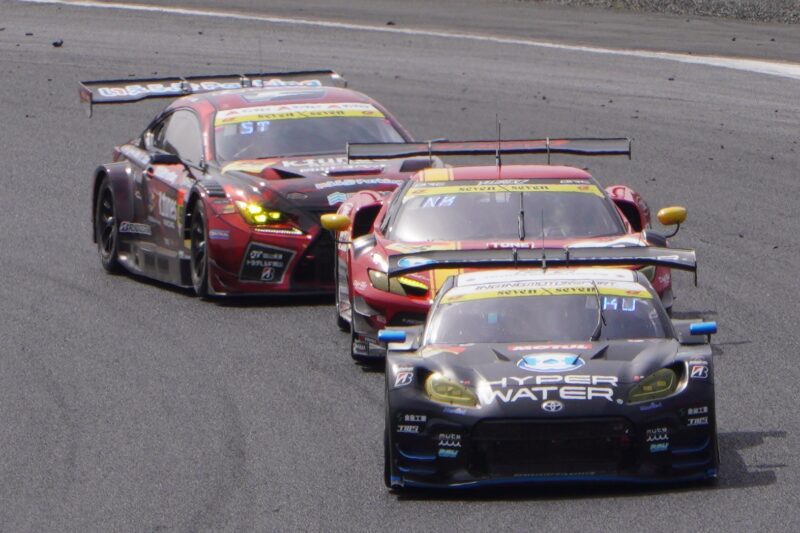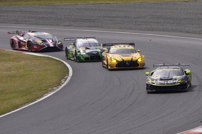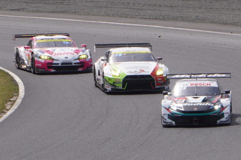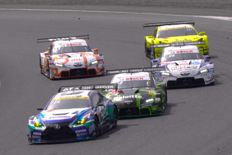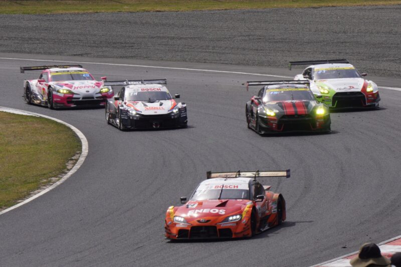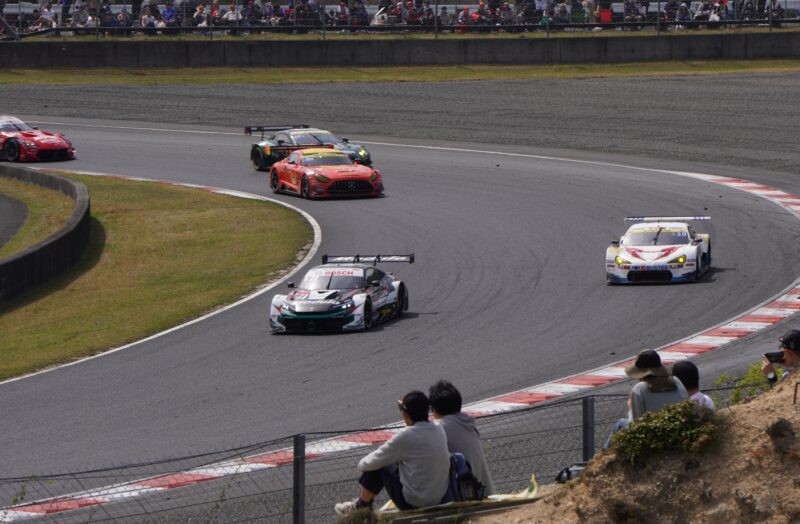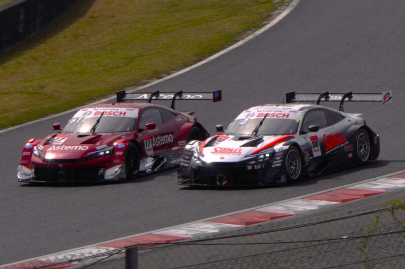 14号車(GT500)TGR TEAM ENEOS ROOKIEのTOYOTA GR Supra GT500(福住 仁嶺)、360号車(GT300)TOMEI SPORTSのNISSAN GT-R NISMO GT3(金丸 ユウ)、100号車(GT500)STANLEY TEAM KUNIMITSUのHonda HRC PRELUDE-GT(牧野 任祐)、25号車(GT300)HOPPY team TSUCHIYAのTOYOTA GR Supra(松井 孝允)、アウト側に48号車(GT300)NILZZ RacingのNISSAN GT-R NISMO GT3(ジェームス・プル)、トヨタ、ニッサン、ホンダと日本のメーカーがしのぎを削ります。