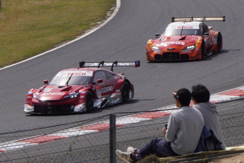 17号車(GT500)Astemo REAL RACINGのHonda HRC PRELUDE-GT(野村 勇斗)、14号車(GT500)TGR TEAM ENEOS ROOKIEのTOYOTA GR Supra GT500(福住 仁嶺)(2026.4.12 14:09)