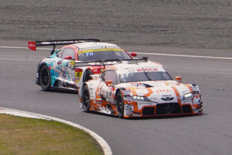 4連覇を目指しトップを追走する36号車(GT500)TGR TEAM au TOM’SのTOYOTA GR Supra GT500(坪井 翔)、4号車(GT300)GOODSMILE RACING & TeamUKYOのMercedes AMG GT3(片岡 龍也)(2026.4.12 14:10)